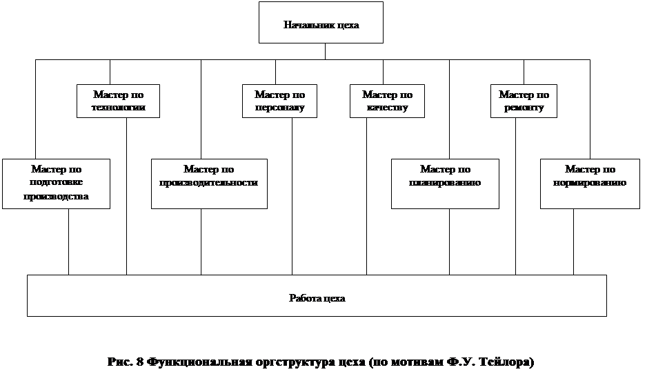 Ф.У. Тейлор предложил не разбивать цех на несколько участков, возглавляемых каждый своим мастером-единоначальником, а поставить у руководства восемь мастеров, специализированных на выполнении определенного вида управленческих работ (функции управления). Аналогичным образом предлагалось организовывать управление и на более высоких уровнях. Примерная схема функциональной оргструктуры представлена на рис. Естественно, что формирование функциональной структуры должно осуществляться с соблюдением определенных принципов которые обеспечивают работоспособность системы.