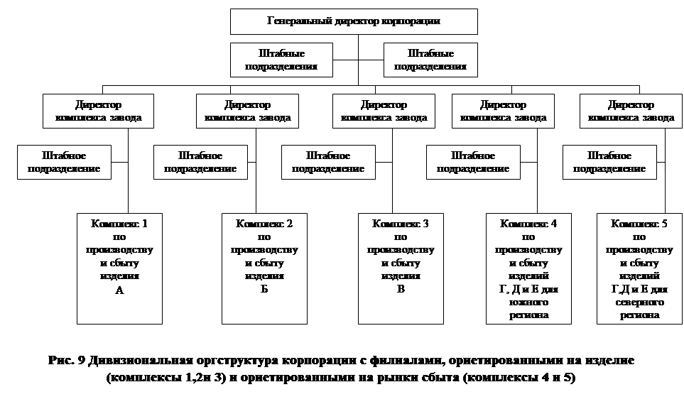 Дивизиональная (филиальная) оргструктура изображена на рис. 9. Дивизионы (филиалы) выделяются или по области деятельности, или географически. Дивизиональныеструктуры управления ориентируются на изделия, технологии, рынки сбыта, регионы.