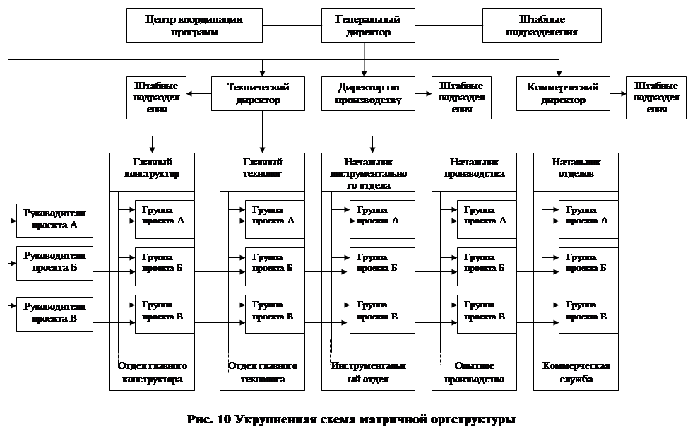 Такая схема давно применялась в управлении НИОКР, а сейчас широко используется в фирмах, ведущих работу по многим направлениям. Она все более вытесняет линейно-функциональную структуру управления.