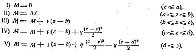 Выражение изгибающего момента для каждого последующего участка целиком включает в себя выражение предыдущего участка и отличается добавкой нового слагаемого. При переходе от четвертого к пятому участку указанная закономерность сохранена специально. Для этого нагрузка q продолжена на пятый участок (до конца балки) и добавлена отрицательная нагрузка q.