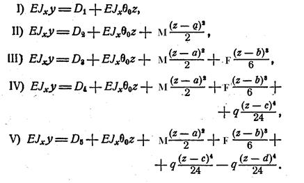 Постоянные Di определяются из условий неразрывности функции y на границе участков. Поэтому D1=D2=D3=D4=D5=EIxy0, y0 – ордината упругой линии в начале координат.