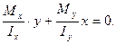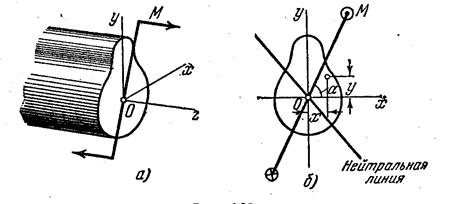 , т.е. брус будет изгибаться не в плоскости М, а в некоторой другой плоскости, где жесткость на изгиб будет меньше. Поэтому нейтральная линия не перпендикулярна к плоскости М, а повернута в сторону оси минимального момента инерции.