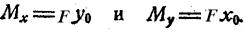 Пусть К(x0 y0) точка приложения F. Тогда относительно осей x,y она дает моменты