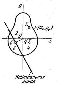 При положительных x0 и y0 по крайней мере одна из величин x и y,уравнения нейтральной линии должна быть отрицательной. Следовательно, если F находится в первом квадранте, то нейтральная линия проходит с противоположной стороны центра тяжести через квадранты 2,3 или 4.