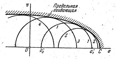 Пусть предельное состояние не зависит от σ2. Далее на этой же диаграмме вычертим круги Мора для нескольких других предельных напряженных состояний. Получим семейство кругов Мора для предельных напряженных состояний. Пусть огибающая всех предельных кругов Мора будет единственной, независимо от величин промежуточных главных напряжений σ2. Форма огибающей зависит от свойств материала и является его механической характеристикой.