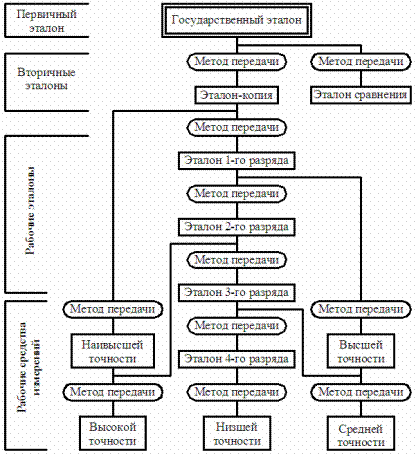 На рисунке 7 приведен один из вариантов схемы передачи информации о размере единицы от государственного эталона к средствам измерений, из которой видно, что от вторичных эталонов информацию о размере единицы получают нижестоящие эталоны (1–го, 2–го, 3–го и 4–го разрядов) и рабочие средства измерений. Но допускается использование рабочих средств измерений для передачи информации о размере единицы другим средствам измерений.