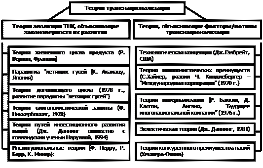 Транснационализация (с конца XIX в.) – это создание и развитие межнациональных воспроизводственных комплексов (международных корпораций) за счет перенесения части воспроизводственного процесса из одной страны в другую на основе МРТ и интернационализации производства и капитала в форме прямых иностранных инвестиций (ПИИ)