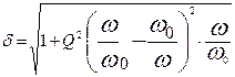 Модуль коэффициента усиления на частоте ω, отличной от резонансной частоты ω0