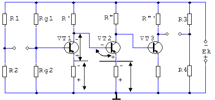 При отсутствии сигнала на входе усилителя на его выходе должна отсутствовать не только переменная составляющая, но и постоянная составляющая напряжения. Это достигается введением делителя R3, R4, который компенсирует постоянную составляющую напряжения, поступающую на нагрузку усилителя с коллектора третьего транзистора. Делитель напряжения R3, R4 компенсирует падение напряжения, поступающее на источник сигнала с резистора Rд2, и сохраняет смещение на входе транзистора VT1 неизменным при включении и выключении источника сигнала.