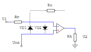 При уменьшении UВХ выходное напряжение не изменяется до тех пор, пока потенциал точки «А» не станет равным нулю. Тогда выходное напряжение скачком изменится до UВЫХmin.