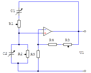 Резисторы R3, R4, R5 соединяют выход с неинвертирующим входом ОУ. Резисторы R4 и R5 определяют требуемый коэффициент усиления, а терморезистор R3 стабилизирует амплитуду и снижает искажения выходного напряжения.