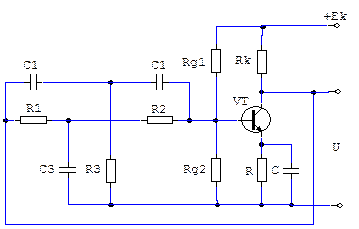 На принципиальной схеме RC-автогенератора с несимметричным двойным Т-образным мостом (рис.13.9) выходное напряжение обозначено «U»; цепочка эмиттерной термостабилизации − «RC»; делитель напряжения − «Rg1», «Rg2».