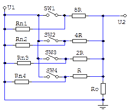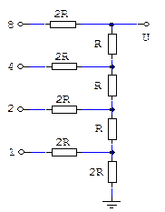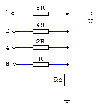 Наиболее простейшим ЦАП является взвешивающая резистивная матрица (рис.14.6), в которой сумма токов Σ I, протекающих через общий резистор RО, пропорциональна весовым коэффициентам двоичных разрядов, а выходное напряжение (при R0< R) пропорционально двоичному члену UВЫХ =Σ I·R0. На рисунке 14.6 выходное напряжение обозначено «U».