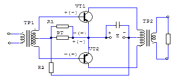 Эти напряжения UВХ1 и UВХ2 получены при помощи входного трансформатора ТР1 со средней точкой во вторичной обмотке (трансформатор является нагрузкой предоконечного каскада). Нагрузкой транзисторов VТ1 и VТ2 является первичная обмотка трансформатора ТР2 (со средней точкой), включенная в общую коллекторную цепь обоих транзисторов.
