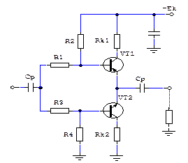 Схема образована двумя однотипными транзисторами VТ1 и VТ2, включенными последовательно по постоянному току, а по переменному току (т.е. по отношению к нагрузке) – параллельно. Так как транзисторы включены последовательно, то источник питания должен иметь удвоенное значение напряжения ЕК. При этом, параллельное включение дает возможность уменьшить значение нагрузки RН.