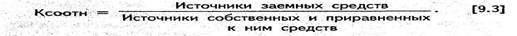 Коэффициент соотношения источников заемных и собственных средств (Ксоотн) показывает, сколько заемных источников средств приходится на 1 гривню собственных источников средств. Критическое значение для показателя < 1. Чем выше значение этого коэффициента, тем сильнее зависимость предприятия от внешних источников, тем ниже его финансовая устойчивость. Однако надо учитывать характер хозяйственной деятельности и скорость оборота оборотных средств предприятия. Быстрая оборачиваемость оборотных средств позволяет определять практическое значение рассматриваемого коэффициента и выше 1.