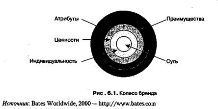 Данная методика, используемая при разработке бренда, разработана сотрудниками рекламного агентства Bates. Суть метода, названного «Колесо бренда» (Brand Wheel) в том, что бренд рассматривается как набор из пяти «оболочек», вложенных одна в другую. «Колесо бренда» позволяет детально описать и систематизировать все аспекты взаимодействия бренда и потребителя.
