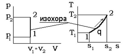 1.Изохорный процесс, протекающий при постоянном объеме, V=const, согласно уравнению состояния pυ=RT, следует, что давление газа пропорционально его абсолютной температуре, т. е.