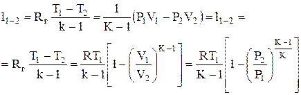 Все соотношения, вытекающие из уравнений политропных процессов p×vn=const; T×vn-1=const; Tn×p1-n=const, должны быть аналогичными соотношениям, вытекающим из соответствующих уравнений адиабатного процесса и получаются путем замены показателя адиабаты k на показатель политропы n. Однако при этом необходимо иметь в виду, что теплоемкость политропного процесса определяется по формуле