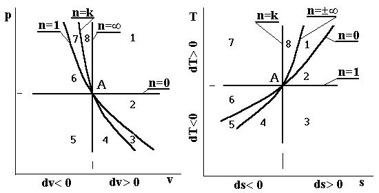Изотерма (n=1) делит рассматриваемое поле координатной плоскости на две части: в областях 1, 2, 7, 8 процессы протекают с повышением температуры (dT>0), а в областях 3, 4, 5, 6 процессы протекают с понижением температуры (dT<0). В области 3 между изотермой (n=1) и адиабатой (n=k) при подводе теплоты (ds>0) происходит падение температуры (dT<0), а при отводе теплоты (ds<0) в области 7 происходит повышение температуры (dT>0).