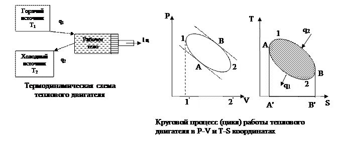 Теплота q1 подводится к рабочему телу от горячего источника с Т1, рабочее тело расширяется по линии 1В2 и совершает работу равную площади 1В22'1'1 (на диагр. Р-V). В непрерывно действующем тепловом двигателе этот процесс повторяется многократно, но для этого необходимо рабочее тело вернуть в исходное состояние. Этот переход можно осуществить в процессе 2А1 по кривой сжатия, лежащей ниже кривой расширения (если по линии 2В1, то работа lц=0, что бессмысленно). Работа сжатия равна площади 2А11'2'2, тогда работа цикла будет равна разности площадей работы расширения и сжатия, т. е. lц=пл. 1В2А1. в этом цикле можно выделить участок подвода теплоты q1 (диагр. Т-S) и участок отвода теплоты q2, соответственно площади А'А1ВВ' и А'А2ВВ'.