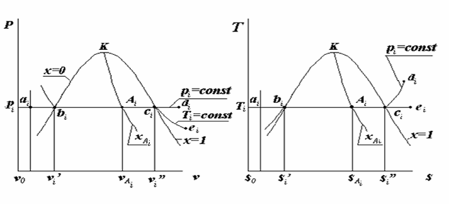 На участке bi-ci соотношение фаз (воды и пара) претерпевает изменение по изобаре от точки к точке, для количественной оценки которого используется степень сухости пара х (0 ≤ х ≤ 1), численно равная массовой доле пара в этой двухфазной среде. Степень сухости пара в точке bi: x = 0, в точке сi: x = 1.