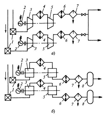 а – с турбокомпрессорами; б – с поршневыми компрессорами; 1 – воздухозаборное устройство и фильтры очистки воздуха от пыли; 2 – привод; 3 – первая ступень (секция) компрессора; 4 – промежуточный холодильник; 5 – вторая ступень (секция) компрессора; 6 – концевой холодильник; 7 – концевой холодильник; 8 – ресивер (воздухосборник)