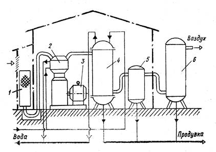 Компрессорная станция располагается в отдельном здании и включает основное и вспомогательное оборудование. Основное оборудование составляет компрессор 2 с электродвигателем 3. Вспомогательное оборудование включает фильтр 1, концевой охладитель воздуха 4, влагомаслоотделитель 5 и ресивер (воздухосборник) 6, Кроме того, на компрессорной станции имеются трубопроводы различного назначения с арматурой, необходимая контрольно-измерительная аппаратура.