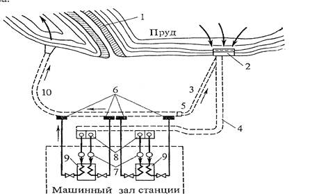 1 – направляющая дамба; 2 – водоприемники; 3 – перепускной канал; 4 – приемные самотечные каналы; 5 – переключательный колодец; 6 – сливные (сифонные) колодцы; 7 – циркуляционные насосы; 8 – приемные колодцы; 9 – конденсаторы; 10 – сливной канал.