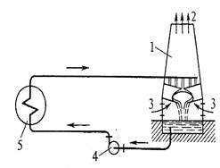 Рис. 4.2. Схема циркуляции воды при охлаждении ее в градирне. 1 – градирня; 2 – выход нагретого влажного воздуха; 3.-вход холодного воздуха; 4 – циркуляционный насос; 5 – конденсатор.