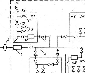 На рис. 5.2 приведена схема газоснабжения завода с ГРП на вводе и цеховыми ГРУ. По этой схеме предприятие снабжается газом от газопровода высокого давления 1 через задвижку 2 с компенсатором 3 на вводе. В центральном ГРП 4 давление снижается до среднего. По межцеховому газопроводу 5 через отключающее устройство (задвижка) 6 на вводе в цех газ поступает во внутрицеховой газопровод 8. На среднем давлении работают агрегаты цехов №№ 2 и 4. В цехах №№ 1 и 3 агрегаты работают на низком давлении газа, поэтому для снижения давления газа в каждом из этих цехов установлена цеховая ГРУ 7. Перед газоиспользующими агрегатами устанавливаются главные отключающие устройства 9. На продувочном газопроводе 12 имеется кран 10 и штуцер с краном 11 и пробкой для взятия пробы газа на анализ.