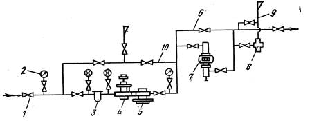 1 – отключающее устройство; 2 – манометр; 3 – фильтр; 4 – предохранительный запорный клапан; 5 – регулятор давления; 6 – обводной газопровод счетчика; 7 – газовый счетчик; 8 – предохранительный сбросной клапан; 9 – сбросной трубопровод; 10 – обводной газопровод