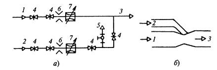 а – схема газопроводов газосмесительной станции; б – схема смесителя; 1 – газопровод ведущего газа; 2 – газопровод ведомого газа; 3 – газопровод смешанного газа; 4 – запорно-отключающее устройство; 5 – продувочная газовая свеча; 6 – измерительная диафрагма; 7 – дроссельное устройство