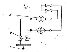 Жидкий хладоагент по трубопроводу 1 из конденсатора поступает к терморегулирующим вентилям 2, где дросселируется и направляется в охлаждающие приборы 3 (испарители). Чувствительный патрон терморегулирующих вентилей укрепляется на всасывающем трубопроводе 4, по которому пар поступает к компрессору.