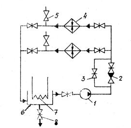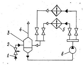 На рис. 6.3 изображена схема с нижней подачей хладоагента в приборы охлаждения и вертикальным циркуляционным ресивером. Жидкий хладоагент из конденсатора или ресивера по трубопроводу 1 подается в циркуляционный ресивер 3 через регулирующий вентиль 2. Образовавшийся при дросселировании пар отделяется в ресивере и через трубопровод 4 отсасывается компрессором. Жидкий хладоагент скапливается в нижней части ресивера и направляется к насосу 6, который подает жидкий хладоагент в при