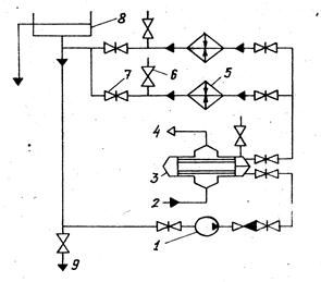 Заполнение хладоносителем обеспечивается установкой в самой верхней части системы расширительного бака 8 достаточной вместимости. Жидкий хладоагент 2 подается в испаритель 3, образовавшийся пар 4 отсасывается компрессором. Насос 1 подает хладоноситель в испаритель, где он охлаждается, и затем в приборы охлаждения 5; подача регулируется задвижками 7. Избыточный хладоноситель 9 выпускается в сливной бак. Для удаления воздуха из контура хладоносителя служат вентили 6.