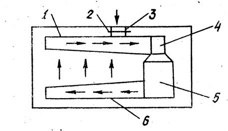 Вентилятор 4 отсасывает отепленный воздух из камеры по воздуховоду 1, расположенному под потолком камеры. Проходя через воздухоохладитель 5,воздух охлаждается, осушается и по воздуховоду 6 нагнетается в охлаждаемую камеру. При вентиляции камеры в воздухоохладитель через воздуховод 3 подают наружный воздух, количество которого регулируется шибером 2.