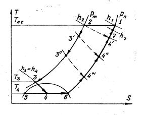Воздух при температуре, близкой к температуре окружающей среды Т ос, и низком давлении рп = 0,1 МПа поступает в компрессор I, где его давление повышается до рm > рп и охлаждается в охладителе II до первоначальной температуры. При этом в окружающую среду отводится теплота Q ос. Далее осуществляется регенерация теплоты в теплообменнике III и воздух подается к дроссельному вентилю IV. Ожиженный воздух из отделителя жидкости V отводится на ректификацию. Оставшийся воздух в состоянии сухого насыщенного пара с температурой Т 6 проходит обратным потоком через регенеративный теплообменник, где нагревается до температуры Т 7 и выводится в окружающую среду.