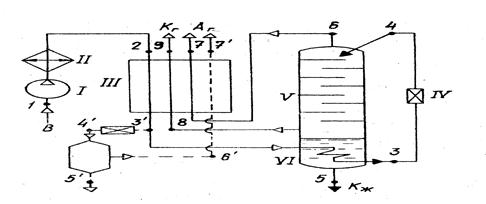 При разделении воздуха часть процесса ожижения, протекающего в отделителе жидкости и дросселе (отмечена штриховой линией), осуществляется совместно с процессом ректификации. Сжатый в компрессоре I и охлажденный в охладителе II воздух после регенеративного теплообменника III (точка 3 ') поступает в дроссельный вентиль IV через змеевик VI, расположенный в нижней части ректификационной колонны V. В змеевике сжатый воздух дополнительно охлаждается и ожижается, так как температура его кипения выше температуры в нижней части колонны (испарители), где давление над жидкостью 0,14... 0,16 МПа. Полученный жидкий воздух (точка 3) дросселируется до давления в колонне (точка 4) и флегма подается на верхнюю тарелку колонны. Таким образом, змеевик служит как бы продолжением теплообменника III.