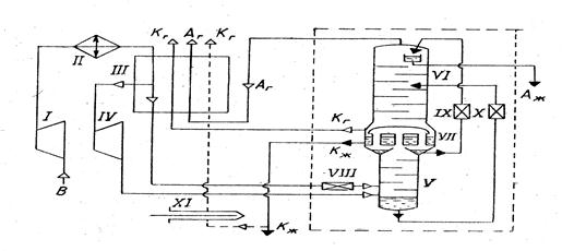 В конденсаторе-испарителе собирается кипящий кислород, откуда он может отводиться либо в газообразном (К г), либо в жидком (К ж) состоянии. Из верхней части колонны VI отводится газообразный (А г) или жидкий (А ж) азот.