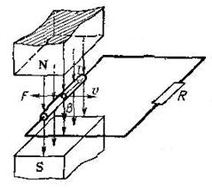Направление индуктированной ЭДС определяем по правилу правой руки. Подключим к проводнику через пластины 2 нагрузку в виде сопротивления R, тогда согласно законам Ома для всей цепи