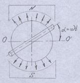 где a - угол между плоскостью катушки, расположенной на роторе, и нейтральной плоскостью ОО’. При вращении ротора с угловой скоростью ω в каждой активной стороне витка катушки (число витков W), согласно явлению электромагнитной индукции, наводится ЭДС. Тогда, ЭДС индуктируемая на концах этой катушки, будет равна