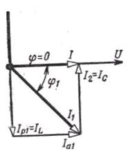 В этом случае максимальная мощность, затрачиваемая на получение магнитного поля (U/IL), равна максимальной мощности, затрачиваемой на получение электрического поля (UIC), а следовательно, равны и максимальные значения энергии в магнитном и электрическом полях цепи WLм=WCм. Как и в рассмотренном выше колебательном контуре, в течении одной четверти периода энергия, запасаемая в электрическом поле, целиком получается от магнитного поля, а в течении второй четверти периода энергия, запасаемая в магнитном поле, целиком получается от электрического поля. От генератора в цепь поступает только энергия, расходуемая в активном сопротивлении. Т.к. реактивные слагающие тока компенсируют друг друга, то в цепи генератора проходит только активный ток, обусловленный потерями энергии в активном сопротивлении.