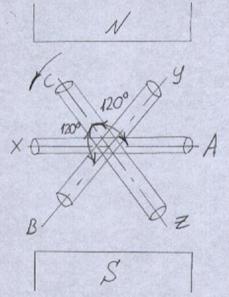 Если к каждой из рамок AX, BY и CZ подсоединить нагрузку (посредством щеток и контактных колец), то в образовавшихся цепях появятся токи.