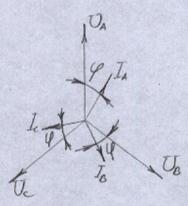 Векторная диаграмма трехфазных напряжений и токов при симметричной нагрузке изображена на рис.5-3.
