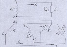 Для такого соединения необходимо фазу А генератора (начало фазы) соединить с концом фазы С, т.е. с точкой Z; начало фазы В соединить с концом фазы А (точка X) и начало фазы С (точка С) соединить с концом фазы В (точка Y). Поэтому, при таком соединении фазное напряжение генератора (потребителя) равно линейному напряжению генератора (при нормальных режимах работы такой цепи).