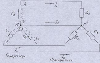 Соединить звездой генератор (потребитель) это значит соединить в одну общую точку, называемой нулевой (N – для генератора, N’ – для потребителя), концы фаз обмотки генератора (потребителя). АВС – начало фаз обмотки генератора, XYZ – конец фаз обмотки генератора.