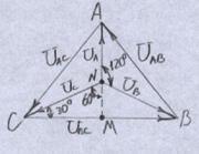 Векторные диаграммы фазных и линейных напряжений генератора трехфазного тока (она же справедлива для трехфазного потребителя с симметричной нагрузкой).
