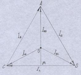 2. для нахождения значений линейных токов надо теперь соединить вершины векторов фазных токов и отложить вектор (стрелку) приняв во внимание выражение (1). Получили равносторонний треугольник АВС, где вектора линейных токов