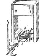 В воздушном зазоре А (рис.6-1) между неподвижным стальным цилиндром Б и полюсными башмаками N’S’ магнит NS создает однородное радиальное магнитное поле. В этом поле расположена прямоугольная катушка – рамка В, укрепленная на двух полуосях – кернах, установленных в опорах. На передней полуоси закреплена указательная стрелка, под свободным концом которой расположена шкала. Обмотка рамки состоит из изолированного провода малого сечения на номинальный ток 10-100 мА.